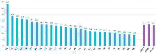 Employers and workers contribute to a social insurance plan that covers pensions, healthcare, and other forms of social security. In 2019, this effectively required taxes and social contributions in Europe’s 27 member states, which accounted for 40.1% of GDP. The tax burden was higher compared to other advanced countries, 6.3 percentage points more than the OECD average (33.8%), and more than 15 percentage points higher than the US average [78].
