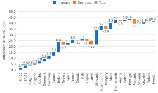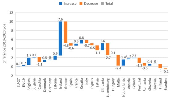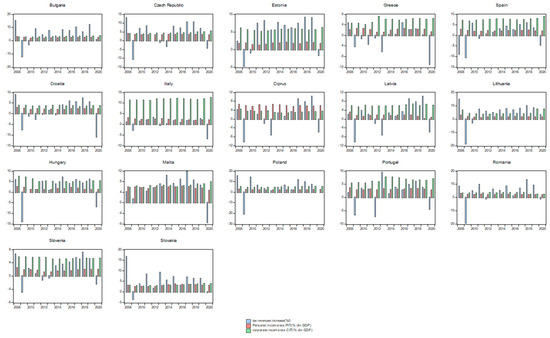 The highest increase in direct taxes among EU countries in 2020 when compared to 2010 has been registered by Lithuania (12.1 percentage points), followed by Ireland (8.4 percentage points) and Malta (5.2 percentage points), while on the opposite side, the highest decrease in direct taxation has been registered by Romania (−3.9 percentage points) and Latvia (−3.2 percentage points) (Figure 2).