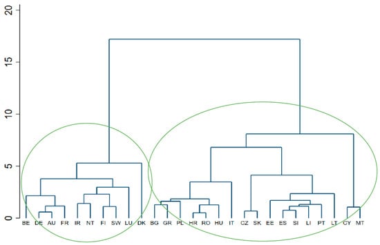 In order to obtain homogeneous clusters of countries from the point of view of fiscal efficiency, hierarchical clustering was applied based on the Ward Euclidean distance method. Ward’s method is the most effective for performing all hierarchical classification algorithms [76]. It explicitly deals with the problem of homogenisation of classes, i.e., minimising intracluster variability. At each step, those two clusters are merged, and the cluster variability of the result is the smallest of all cluster merging possibilities. An essential premise of Ward’s method is the decomposition of the total variance into intra-cluster variance and inter-cluster variance, as follows: