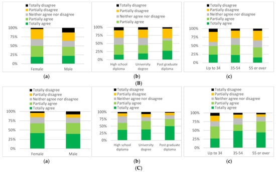 Socio-demographic variables are considered in the literature on the topic as factors capable of explaining differences in individuals’ beliefs, motivations and purchasing choices. In particular, among these variables, the most considered in the analyses are gender, age and the level of education of the respondents [8,10,11,25,29,34,35].