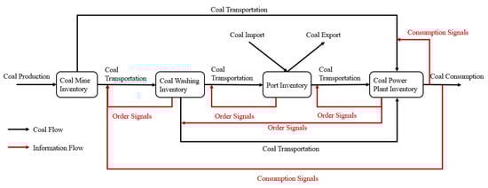 In the dynamic management of the supply chain, the mismatch between production capacity and consumption often occurs due to factors such as information delay, response delay, and demand amplification [35]. The object of this study is the power-coal supply chain in China, which includes coal mines, coal washing plants, ports, and power plants, as well as the transportation between each link and the stock of each link. Recognizing the complex and extensive nature of the actual power-coal supply chain, we need to simplify it to four links and three main transport paths.