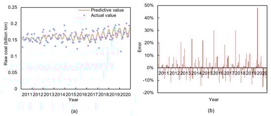 (a) Coal consumption data fitting results; (b) Relative errors from 2011 to 2020.