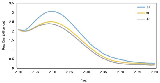 The planning of the coal supply chain involves multiple links, among which the planning and construction of coal mine production capacity is the long-term focus of the government. Coal mine production capacity is closely related to future coal demand and the inventory design of each link. Therefore, we firstly refer to the research of Song et al. [37] to determine the power-coal demand for a high demand situation (HD), a reference demand situation (RD), and a low demand situation at a five year-interval in the future by calculating the power-coal consumption under different coal-fired power generation scenarios, and obtain the year-by-year power-coal demand by polynomial fitting, as shown in Table 5 and Figure 3.