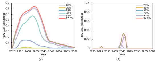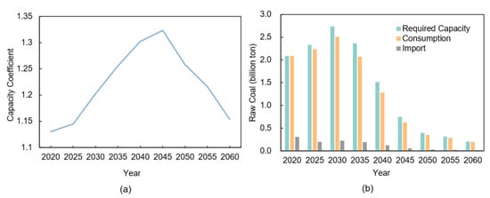 (a) Coal mine production capacity redundancy coefficient from 2020 to 2060 in MDLS; (b) Power-coal supply and consumption from 2020 to 2060 in MDLS.