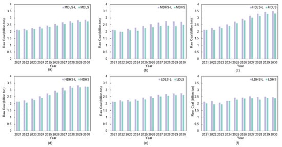 Power-coal import impact in multiple scenarios, where the purple bars represent demand for power-coal mine production capacity under the condition of import cuts and the green bars represent demand for power-coal mine production capacity under normal import conditions. Subfigures (a–f) compare the production capacity demand under six different scenarios.