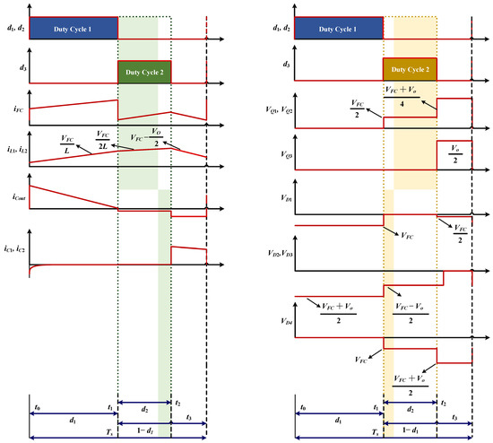 This mode has a time interval between t2–t3. This mode is operated with duty cycle (1–d1–d2), where all the semiconductor switches are turned off. The current direction of Mode 3 is illustrated in Figure 3c. Here, the inverter is supplied by the PEMFC and the inductors directly. Moreover, diode D1 is in a reverse-biased state whereas D2 is forward biased and therefore, the output capacitor Co is charged. The switching stress of Q1 and Q2 in this mode is the average between the PEMFC voltage and the output voltage, while for Q3, the switching stress is half of the output voltage. Like Mode 2, the inductors are connected in series. The inductor current and voltages can be determined in this mode as follows: