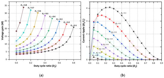 Different combinations of duty cycle to determine the proposed converter’s: (a) voltage gain, and (b) current ripple.