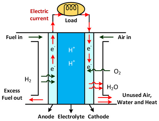 A PEMFC utilizes an electrochemical reaction between an oxidant (air oxygen) and a fuel to generate hydrogen energy. The generated hydrogen travels through the anode to produce an electric current whereas the oxidant continues to flow through the cathode [32]. The reaction results in the release of water and heat. Fuel cells are employed as a quiet and dependable source of electricity because they have no moving parts [33]. Figure 5 [34] provides specifics regarding the PEMFC’s overall configuration and equivalent circuit.