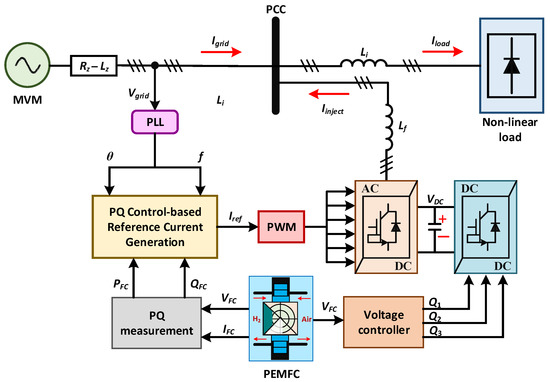 A DC-AC inverter is also an important interfacing device for the fuel cell integrated microgrid alongside the DC-DC converter. The DC-AC inverter is capable of power conversion from the DC-DC converter as well as active power filtration. While using the fuel cell for the power generation system, the microgrid current (Igrid) needs to be sinusoidal and in-phase with the microgrid voltage (Vgrid) [4]. These two tasks are done by the controller of the DC-AC inverter. In this paper, for phase synchronization, a phase-locked loop (PLL) controller is utilized, while for active power filtration, a conventional PQ-based reference current generation method is utilized. The reference current generated from the PQ controller is then sent to a PWM block to generate the switching pulses for the DC-AC inverter. The implementation of the PLL and the PQ controller is discussed elaborately in [37,38], respectively.
