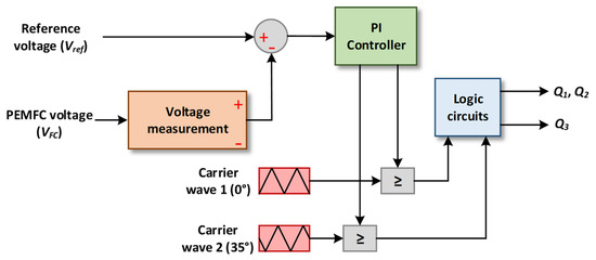 The ripple in the output current has a substantial impact on a PEMFC’s lifespan [36]. The two most common types of ripples that can be observed in the output current of a PEMFC are high frequency and low frequency ripple. High frequency ripples are generated due to the switching operation of the DC-DC converter. Thus, the converter is operated using a triangular PWM, and as a result, high frequency ripples are significantly reduced. Subsequently, the active power injection and filtration is done by the inverter. Since the inverter does not have constant output power, DC bus voltage persists with low frequency voltage ripple. Due to these voltage ripples, low frequency current ripples are generated in the PEMFC’s output if no proper voltage controller is implemented for the converter [13]. Thus, it is necessary to implement an effective voltage control mechanism to reduce the voltage ripple. The voltage control diagram for the proposed converter is depicted in Figure 8. The active power of the PEMFC is determined by the preset voltage reference (Vref). Voltage measurements are utilized for detecting the PEMFC’s output voltage. The reference voltage and the measured voltage are delivered to a subtractor, and then the output response from the subtractor is delivered to a proportional integral (PI) controller. Then this controller’s output is delivered to PWM circuit to compare with two triangular carrier signals respectively. Moreover, a combination of different logic circuits is applied to generate the desired switching pulses. Finally, these switching pulses are used to control the operation of the three switches of the proposed converter module.