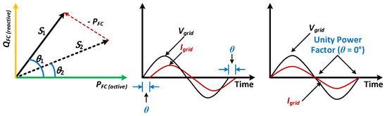 The operation of traditional active/reactive (PQ) power techniques is dependent on the actual power and the reference power, whereas the calculated power value is utilized to maintain the power flow between the fuel cells and the microgrid. The proposed system compares the actual active power with the active power injected from the fuel cell inside the PQ controller in order to maintain the power flow from the power generation side to the load side. Therefore, the fuel cell must have the ability to support the microgrid in order to support the load side power demand when the grid is unavailable. Generally, it is assumed that during load transients, active power is completely delivered by the microgrid in electrical load and thus, inside the PQ controller, power management is required. However, in a practical scenario when the microgrid needs support, the fuel cell must have the ability to deliver the required power through electrical loads. If not, the voltage and current of the microgrid become out-of-phase resulting in power factor deterioration. Therefore, to resolve these issues, a fuel cell’s injected power needs to be injected alongside the microgrid for power factor correction to improve the system’s performance. Hence, the interfacing devices including the DC-DC converter and the AC-DC inverter of the fuel cell are integrated into the power system to manage the power and ensure an optimal grid-side power factor. The relation between the active power, reactive power, and power factor along with the phase analysis of the microgrid’s voltage/current and how the injected active/reactive power from the fuel cell is helping to keep the power factor unity is shown in the phasor diagram of Figure 9. The system parameters utilized to develop the PEMFC integrated microgrid are summarized in Table 2.