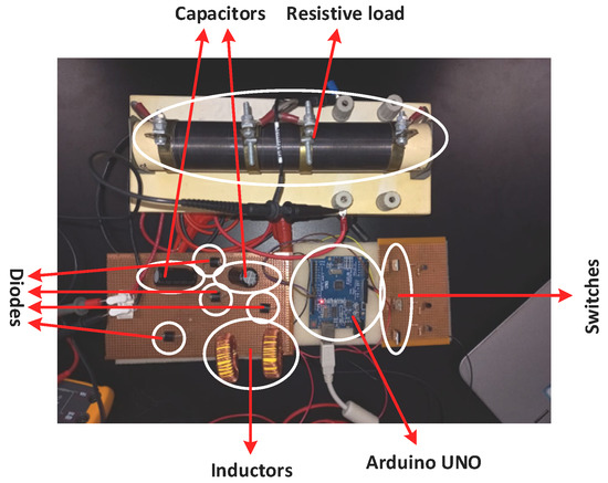 The performance verification of the proposed converter is evaluated by building a hardware prototype as illustrated in Figure 10. Table 3 includes the hardware specifications of the hardware prototype for the proposed converter topology. An Arduino UNO controller is integrated with the proposed converter topology for adequate switching control that includes phase delay, duty ratio, and switching gale pulses.