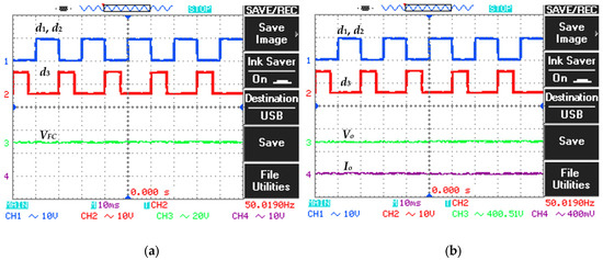Figure 11 depicts the switching pulse patterns of VGQ1, VGQ2, and VGQ3 that are utilized to control the switches Q1, Q2, and Q3. The first two switches Q1 and Q2 are coupled with the inductors and operated using a switching frequency of 25 kHz with a duty ratio, d1, of 0.5. The third switch Q3 is operated by a duty ratio, d2, of 0.35 with a switching frequency of 25 kHz. The input voltage of the converter topology from the PEMFC (VFC), is shown in Figure 12a. The evaluated output voltage gain for the proposed converter topology is 20 when integrated to a PEMFC voltage of 20 V. Hence, the voltage gain theoretically and experimentally is verified by implementing the hardware prototype for the proposed converter topology. The output voltage/DC-link voltage, VDC, and the output current, IDC, with switching operation are depicted in Figure 12b. Experimental setup has achieved an output voltage of 400.51 V with an average current of 400 mA.