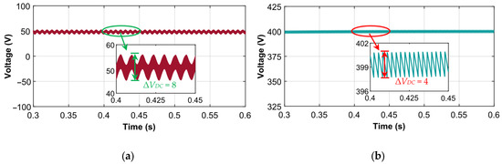 The DC-link voltage ripple of the PEMFC integrated microgrid for the conventional boost converter and the proposed converter are illustrated in Figure 13a,b, respectively. It is evident that the conventional boost converter’s voltage ripple is around 8 V, which is almost 16% of the output voltage. On the contrary, the voltage ripple of the proposed converter is around 4 V, which is only 1% of the output voltage. Moreover, it can be observed that the voltage of the boost converter also contains oscillations. The presence of the voltage ripple can significantly hamper the PEMFC integrated microgrid’s injected current and hence, creates distortions in the microgrid current.