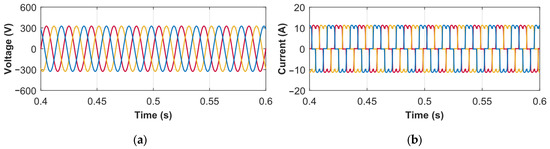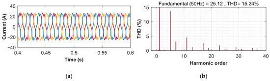 The impact of the voltage ripple produced by the conventional boost converter can be realized while analyzing the harmonic profile of the microgrid current. Here, the PEMFC integrated microgrid is feeding a bridge rectifier connected to a non-linear resistive inductive load (50 Ω–5 mH). The three-phase microgrid voltage (Vgrid) and the non-linear load current (Iload) are depicted in Figure 14a,b, respectively. Moreover, the grid current and its harmonic profile are illustrated in Figure 15 and Figure 16, while the PEMFC is integrated with a conventional boost converter and the proposed interleaved converter, respectively. The red-yellow-blue (RYB) color represent phase a, phase b and phase c, respectively.