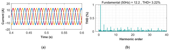 It can be observed from Figure 15a that when the conventional boost converter is applied for integrating the PEMFC with the microgrid, the microgrid’s current has high current ripple. Therefore, there are high harmonics of 15.24% present, as shown in Figure 15b. The resultant THD has violated the IEEE 519 2014 standard which states the THD of a grid-connected system must be less than 5%. This is because the conventional converter has high voltage ripple and thus, the injected current from the inverter is unable to accurately compensate the microgrid current. On the contrary, it can be observed from Figure 16a that when the proposed converter is applied, the microgrid’s current almost becomes distortion-free and the resulting THD is reduced to 3.22%. Thus, in this case the microgrid current has successfully followed the IEEE 519 standard. The significant improvement of the harmonic profile is due to the fact that the proposed converter’s voltage ripple was significantly less than the conventional boost converter and hence, the injected current from the inverter is able to accurately compensate the microgrid current. Moreover, this substantial reduction in the THD profile of the system due to utilizing the high gain converter can improve the power quality of the system.