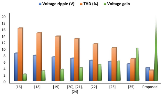 Comparative analysis among various DC-DC converters in terms of voltage ripple, THD, and voltage gain [16,18,19,20,21,22,23,24,25].