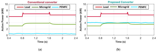The active power status of the PEMFC integrated microgrid is shown in Figure 18 and Figure 19 when the PEMFC is interfaced with the microgrid using a boost converter and the proposed converter, respectively. It can be observed from Figure 18a that because of the low active power of 500 W injected from the conventional converter interfaced PEMFC, the microgrid is unable to satisfy the power demand from any of the electrical loads. On the contrary, due to injecting a high active power of 4 kW from the proposed converter interfaced PEMFC, as observed from Figure 18b, the microgrid is able to satisfy the power demand from all three electrical loads. This inability to inject the required power from the PEMFC to support the microgrid can deteriorate the power factor of the microgrid substantially, as demonstrated in Table 4.