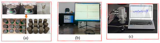 The investigated backfill is made of the unclassified tailings of a copper mine in Jiangxi Province as an aggregate using P.O 32.5 Portland cement produced by Jiangxi Wannianqing Cement Co., Ltd. in Nanchang, China. The latter was mixed with tap water. According to the ratio of backfill commonly used in mines, backfill specimens with slurry concentrations of 75% and cement–sand ratios of 1:4, 1:6, and 1:8 were prepared. In accordance with the International Society of Rock Mechanics’ (ISRM) standards, processing was conducted in a cylinder with a diameter of 50 mm and a height of 100 mm. After downloading, the backfill specimens were placed in a HBY-40B curing box for curing. The HBY-40B is produced by Shaoxing Zeyi Instrument Co., Ltd. in Shaoxing, China. The temperature in the curing box was 20 °C; the relative humidity was controlled at 90%; the curing period was 7 days, 14 days, and 28 days.