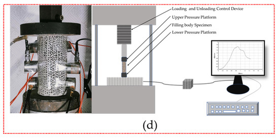 Test materials and equipment. (a) Backfill specimen; (b) acoustic emission system; (c) infrasonic wave acquisition system; (d) test loading system.