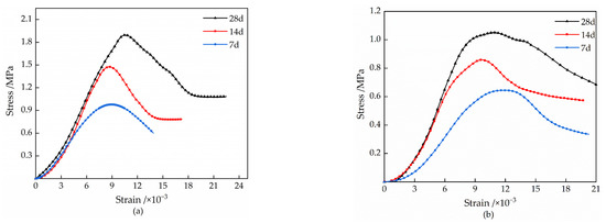 Uniaxial compression tests were carried out on three different cement–sand ratio backfill specimens with curing ages of 7 d, 14 d, and 28 d, and the stress–strain curves of the cemented backfill with unclassified tailings under uniaxial compression were obtained as shown in Figure 2. It can be seen from Figure 2 that the stress–strain curves of the cemented backfill with unclassified tailings at different curing ages have certain differences. That is, with the increase of the curing age, the slope of the straight section of the stress–strain curve of the backfill body increases, and the peak load increases. The strength and elastic modulus of the backfill body are significantly enhanced. At this time, the curing age is positively correlated with the peak stress and elastic modulus. With the extension of the curing age from 7 days to 28 days, the average compressive strength of backfill specimens with cement–sand ratios of 1:4, 1:6, and 1:8 increased from 0.95 MPa to 1.83 Mpa (an increase of 92.6%), 0.64 Mpa to 1.05 Mpa (an increase of 64.1%), and 0.40 Mpa to 0.70 Mpa (an increase of 75.0%), respectively. The average elastic modulus increased from 178.63 MPa to 259.32 Mpa (an increase of 45.2%), 117.62 MPa to 146.62 Mpa (an increase of 24.7%), and 75.32 MPa to 107.79 Mpa (an increase of 43.1%), respectively. The reason for the change is that with the gradual growth of the curing age, the amount of C-S-H gel generated by the cement hydration reaction gradually increases. The compactness of the internal structure of the backfill gradually increases, and the cohesion between the particles gradually increases, which hinders the initiation and expansion of the crack of the specimen. It inhibits the diffusion of energy inside the specimen, so that the energy storage limit of the cemented backfill gradually increases [33].