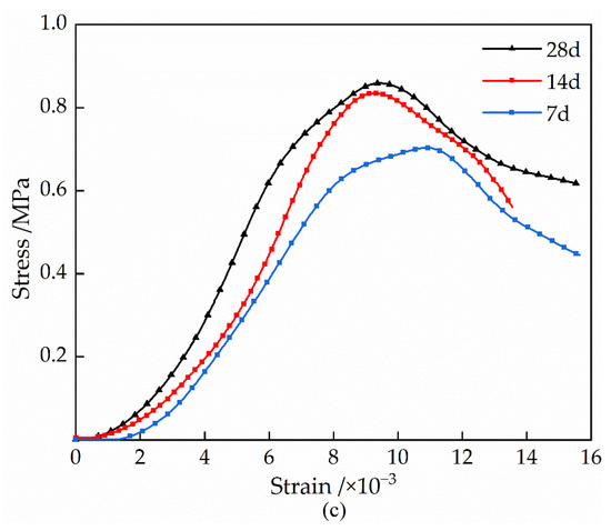 Stress–strain curve of the cemented backfill. (a) Test specimen with a 1:4 cement–sand ratio; (b) test specimen with a 1:6 cement–sand ratio; (c) test specimen with a 1:8 cement–sand ratio.