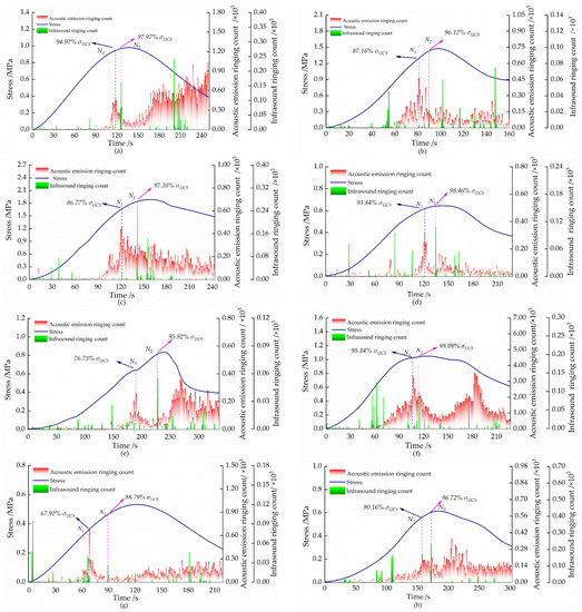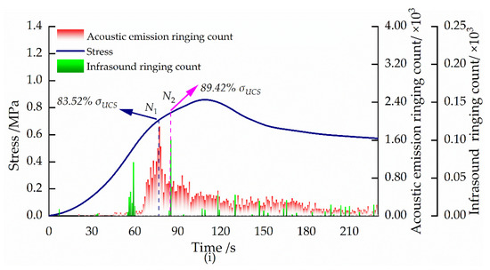 In practical engineering, when using acoustic emissions or infrasound to monitor the stability of backfill, due to the complexity of the failure process of backfill, it is very difficult to predict its instability according to the decrease degree of the acoustic emission ringing count or the “peak” of the infrasound ringing count. However, it can be seen from Figure 3 that when the acoustic emission ringing count begins to decrease, the infrasound ringing count does not have multiple peaks before the rupture. Therefore, acoustic emissions combined with infrasound signals can be used to warn of the instability and failure of backfill. That is, after the ringing count of the acoustic emission begins to decrease (point N1 in the figure), the peak point of the infrasound ringing count (point N2 in the figure) appears for the first time as the early warning point of instability and the failure of backfill.