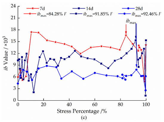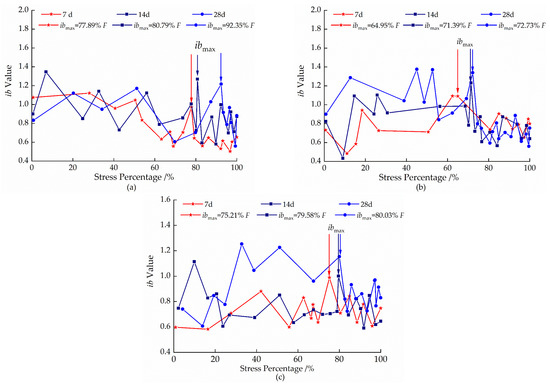 Relationship between ib values and the stress percentage of acoustic emission signals. (a) Test specimen with a 1:4 cement–sand ratio; (b) test specimen with a 1:6 cement–sand ratio; (c) test specimen with a 1:8 cement–sand ratio.