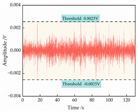 Due to the non-contact propagation of the acquisition method of infrasound signals, the noise will become an unavoidable factor affecting the signal analysis results during the processing of infrasound signals. In order to eliminate the environmental noise in the infrasound signal, the original digital signal is filtered. Various methods of signal filtering are commonly used, such as Fourier transform filtering, wavelet packet filtering, and wavelet threshold filtering [37]. In this paper, the wavelet threshold filtering method is used to filter the acquired original digital signal, and a wavelet decomposition and reconstruction of the original digital signal are performed. Figure 5 shows the ambient noise background signal. The analysis finds that the background signal amplitude is concentrated between −0.0025~0.0025 V, so the threshold value is taken as 0.0025 V.