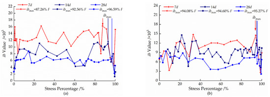 As can be seen from Figure 6, the infrasound ib value of the destruction process of the cemented backfill with unclassified tailings shows a certain pattern with the change of the stress percentage. With a stress percentage of 0~30% and the backfill in the pre-loading stage, due to friction and slip between the particles and a large number of low-energy friction-type infrasound signals the infrasound signal ib value fluctuates and gradually increases. With a stress percentage of 30~85% and the backfill in the middle of the loading stage, the backfill interior fractures gradually to the development of large-scale, internal fractures along the particle links which expand; the proportion of large-scale fractures begin to gradually increase, and the infrasound signal ib value fluctuations are relatively gentle and display a small decrease. The maximum value in this stage, after the stress percentage reaches 85% (ibmax), the filler internal microcracking achieves a quantitative to qualitative transformation. The formation of a macroscopic rupture zone occurs, and the infrasound signal ib value appears to fall. The percentage of stress corresponding to ibmax increases with the increase of the curing age of the backfill with the same cement–tailing ratio. The start of the decline in a jumping manner of the infrasonic signal ib value represents the formation of the macroscopic rupture zone of the backfill, and this feature can provide certain criteria for the destruction of the backfill.