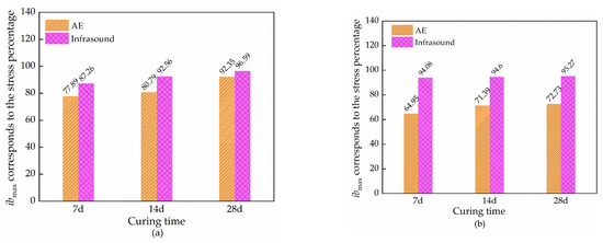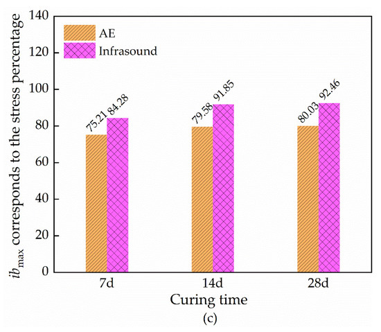 From Figure 7, it can be seen that the stress percentages corresponding to infrasound ibmax and acoustic emission ibmax during the damage of the backfill both increase with the age of maintenance. The percentage of stress corresponding to the infrasound ibmax in the failure process of the backfill is compared with the percentage of stress corresponding to the acoustic emission ibmax. It can be seen that the percentage of stress corresponding to the infrasound signal is always higher than that corresponding to the acoustic emission signal ibmax, because the acoustic emission signal decays more rapidly than the infrasound signal. In the pre-loading period (before a 60% stress percentage), the infrasound picks up more signals than the acoustic emission, and in the post-loading period (after a 60% stress percentage), the acoustic emission picks up more signals than the infrasound. Therefore, a combined analysis of acoustic emission ib values and infrasound ib values is used to better capture the crack-evolution information of the filling damage process.