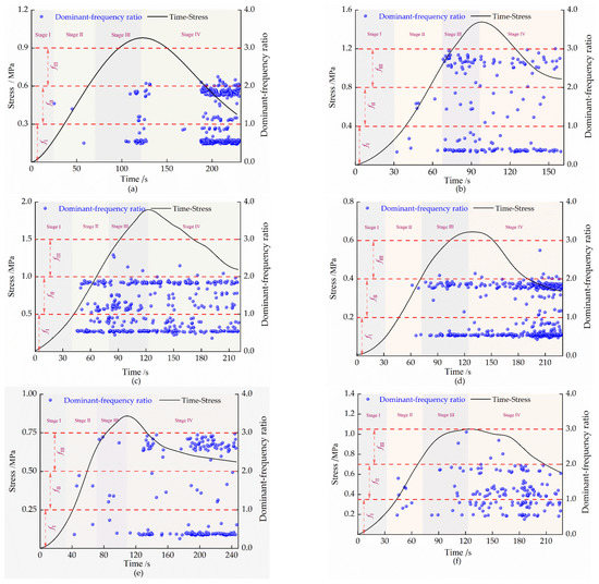 Waveform analysis can extract key information from the acoustic signal, and its extracted spectral features can reflect the acoustic signal characteristics more comprehensively. Due to the complexity and global nature of the spectral characteristics of the acoustic signal during the destruction of material, only the dominant frequency can represent only part of the characteristics of the acoustic signal, but not all of it. It has been demonstrated that the acoustic signal during the destruction of rock materials can appear as a secondary dominant frequency phenomenon [38,39,40,41]. Based on this, this experiment unifies the study of the acoustic signal dominant frequency and the secondary dominant frequency. The dominant frequency ratio F proposed in the literature [41] is a parameter that can characterize the spectral features of the acoustic signal waveform. Due to the complexity of the damage process of backfill and its internal crack evolution, the concept of the dominant frequency ratio FS of the infrasonic signal is proposed in this study based on the parameter FAE of the dominant frequency ratio of the acoustic emission signal.
