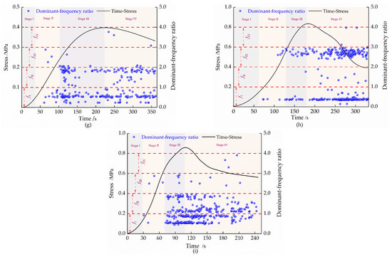 Change of dominant frequency ratio of infrasonic waves in the failure process of backfill. (a–c) Test specimen with a 1:4 cement–sand ratio and a 7~28-day curing age; (d–f) test specimen with a 1:6 cement–sand ratio and a 7~28-day curing age; (g–i) test specimen with a 1:8 cement–sand ratio and a 7~28-day curing age.