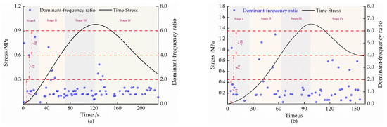It can be seen from Figure 11 that the variation law of the number ratio of class A and B signals of the infrasound in the fracture process of filling the body is similar as a whole, showing a trend of “decrease–increase–decrease”. From stage I to stage II, the ratio of the number of class A and B signals is relatively small (less than 1.5) and decreases slowly. The number of class A and B of the infrasound signals is similar in stage I and stage II, and the relationship between the number of these two classes of signals does not change significantly. In stage III, the ratio of class A and B signals rises rapidly and reaches a maximum value in the range of 1.75 to 3.2.In other words, in stage III, class A of the infrasound signal with a dominant frequency less than the secondary dominant frequency is dominant. In stage IV, the ratio of class A and B of the infrasound signals decreases, and its value is similar to that of stage I and stage II.