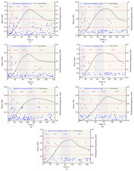 Change of dominant frequency ratio of the acoustic emission in the failure process of backfill. (a–c) Test specimen with a 1:4 cement–sand ratio and a 7~28-day curing age; (d–f) test specimen with a 1:6 cement–sand ratio and a 7~28-day curing age; (g–i) test specimen with a 1:8 cement–sand ratio and a 7~28-day curing age.