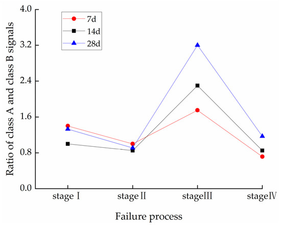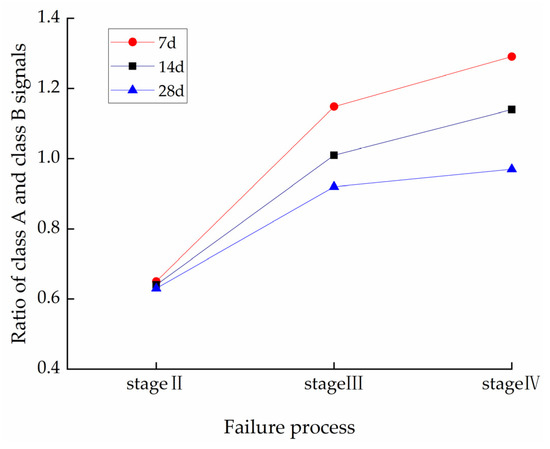 From the analysis of Figure 10, it can be seen that the ratio of the number of class A and B of acoustic emission signals gradually increased during the rupture of the filling, and the average value increased from 0.65 to 1.03 from stage II to stage III. Furthermore, the ratio of the number of class A and B of the acoustic emission signals changed from the dominance of the number of class B of signals to the approximate equality of the number of class A and B of signals. The difference of the number of class A and B signals of acoustic emissions is small in stage III and stage IV. In stage II, the ratio of class A and B signals is smaller (less than 0.7). That is, the crack stable growth stage is dominated by class B of the acoustic emission signals, whose dominant frequency is larger than the secondary dominant frequency. From stage III to stage IV, the change of the ratio of the number of class A and B signals ranged from 0.92 to 1.29, i.e., the number of class A and B of the acoustic emission signals in stage III and stage IV are similar. On the other hand, from the perspective of the curing age, the difference between the number of class A and B signals decreases with the increase of the curing age from stage II to stage III, and the same pattern is observed from stage III to stage IV, but the decrease is smaller.