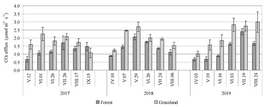 In the forest land, the CO2 effluxes from the soil increased gradually by reaching the maximum between the end of June and the end of September in 2017, between the beginning of May and the end of June in 2018, and between the end of June and the end of August in 2019 (Figure 2). In the grassland, the CO2 effluxes from the soil increased gradually by reaching the maximum between the end of May and the end of July in 2017, between the beginning of May and the end of July in 2018, and between the end of June and the end of August in 2019 (Figure 2). The soil CO2 efflux averaged across the years in the forest land was 32% lower than in the grassland on Retisol (Table 3). The average CO2 efflux from the soil tended to increase in the following order: 2017 < 2018 < 2019. The average soil CO2 efflux in 2017 was 12% lower than in 2018 and 14% lower than in 2019 (Table 3).