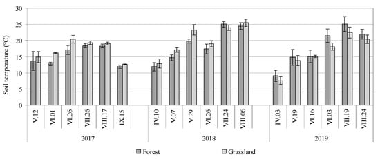 Soil temperature varied from 11.9 °C to 20.4 °C during the growing season in 2017, from 11.9 °C to 25.5 °C in 2018, and from 7.6 °C to 25.1 °C during the vegetation period in 2019, with averages of 16.2 °C, 19.6 °C, and 17.1 °C within the 0–5 cm soil layer in 2017, 2018, and 2019, respectively (Figure 3 and Table 3). The soil temperature average in 2017 was 17% lower than in 2018 and 5% lower than in 2019. The soil temperature averaged across the years revealed that in the grassland soil, the temperature was 3% higher than in the forest land (Table 3).