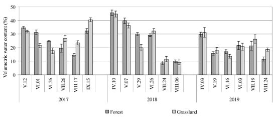 Volumetric water content in the soil varied from 14.4% to 40.5% during the growing season in 2017, from 8.7 to 45.6% in 2018, and from 11.6 to 31.2% during the vegetation period of 2019, with average values of 26.6%, 26.4%, and 20.4% within the 0–5 cm soil layer in 2017, 2018, and 2019, respectively (Figure 4 and Table 3). The volumetric water content average in 2017 was 1% higher than in 2018 and 23% higher than in 2019. The volumetric water content averaged across years was 1% lower in the forest land than in the grassland soil (Table 3).