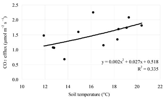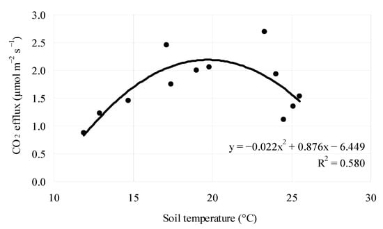 During the whole growing season in 2018, the relationship between soil temperature and CO2 efflux at the 0–5 cm soil layer can be described by a simple multiple regression model (y = −0.022x2 + 0.876x − 6.449; R2 = 0.58, p < 0.05) (Figure 6).
