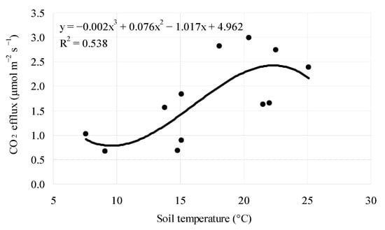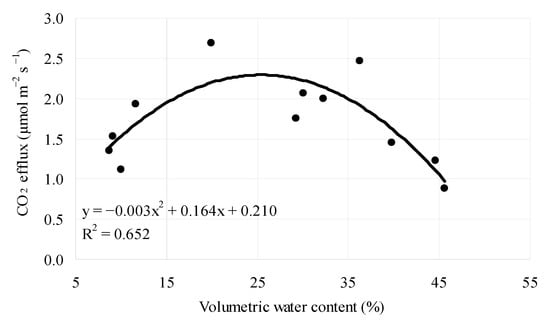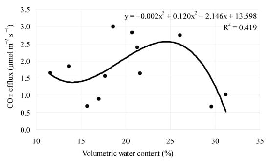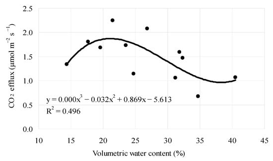 During the whole growing season in 2019, the relationship between volumetric water content and CO2 efflux within the 0–5 cm soil layer (y = –0.002x3 + 0.120x2 − 2.146x + 13.598; R2 = 0.419, p < 0.05) is provided in Figure 10.