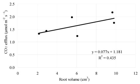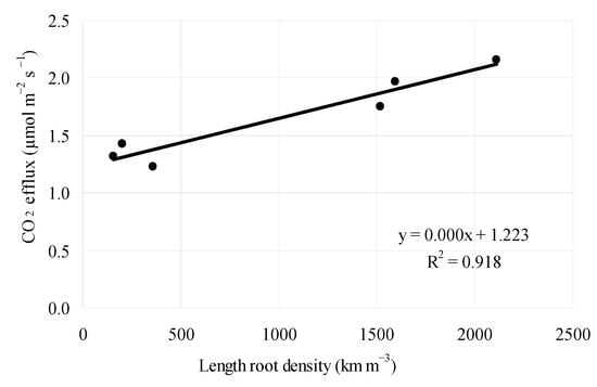 CO2 efflux from the soil is the result of organic matter decomposition, microbial activity, and plant root respiration, which depend on soil moisture and temperature [,]. According to Wei et al. [], soil temperature and soil water not only had an influence on the activity of microorganisms and roots, but also on the diffusion of gases through soil pores. Bortolotto et al. [] stated that soil temperature is the variable that best explains changes in soil CO2 efflux, while soil water content and root network are also important factors for soil CO2 efflux. Our results confirm the statement that soil CO2 efflux was affected by root length density and root volume in both land uses, indicating that the activity of the root plays one of the main roles in the production of CO2 soil emissions. The relationship between the density of the root and CO2 efflux from the soil (y = 0.61 + 0.07x; R2 = 0.64; p < 0.01) was found by Shibistova et al. []. Kochiieru et al. [] described the relationship between the root volume and soil CO2 efflux within the 0–10 cm soil layer under different land uses and soil types as a linear correlation y = 0.33x + 0.83; R2 = 0.58; p < 0.05.