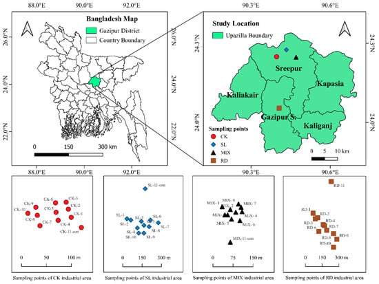 Map showing composite sampling points in four industrial areas in the Gazipur district of Bangladesh.
