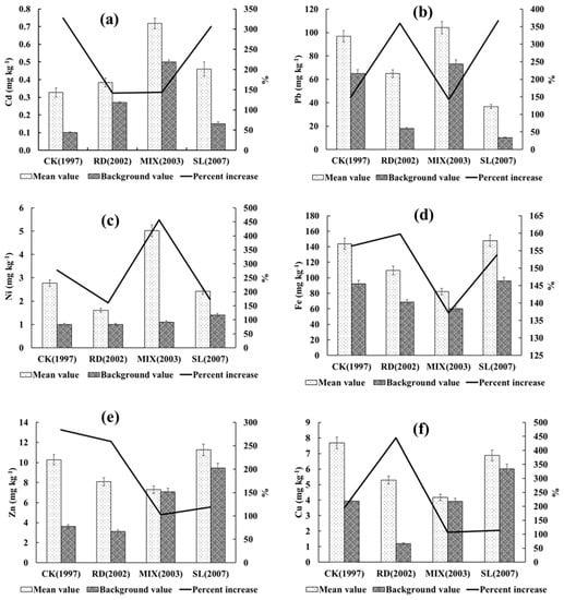 The percent increases of Fe concentration were 159.74, 156.36, 153.80, and 137.00% in the RD, CK, SL, and MIX industries compared to their background concentrations of 68.60, 92.00, 96.00, and 60.00 mg kg−1, respectively (Figure 2d, and Table 2). The percent increase of Zn concentration was the highest (284.06%) in the CK industrial area containing a background value of 3.62 mg kg−1, where the lowest value (102.98%) was observed in the MIX industrial area having a background value of 7.08 mg kg−1 (Figure 2e and Table 2). The highest percent increase of Cu was observed in the RD industry (444.29%) followed by the CK (194.75%), SL (114.30%), and MIX (106.58%) industries, respectively, as compared with their background concentrations (1.19, 3.94, 6.02, and 3.92 mg kg−1) (Figure 2f and Table 2). The ordering of the percent increase of heavy metals in different industrial areas compared to their background values is Ni > Cu > Pb > Cd > Zn > Fe (Figure 2).