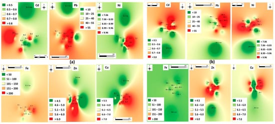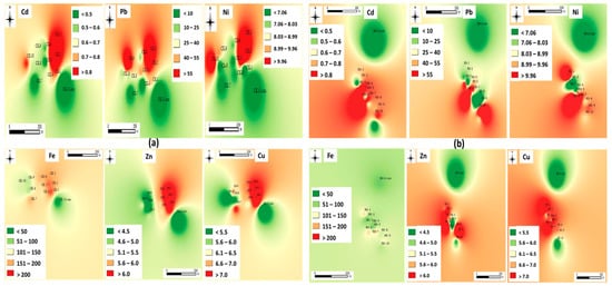 The highest concentrations of heavy metals were found in the source of effluent disposal areas by industrial outlets, and then the concentrations gradually spread to other areas (Figure 3 and Figure 4). This is due to the initial deposition of effluents with higher concentrations of heavy metals near the source, and with increasing time and distance the concentrations decrease. It was reported that there is a decreasing trend in the concentration of heavy metals with increasing distance from contaminated areas [52]. The results of Faccinelli et al. and Martin et al. also revealed the similar spatial distribution of heavy metals in paddy field soil [53,54,55].