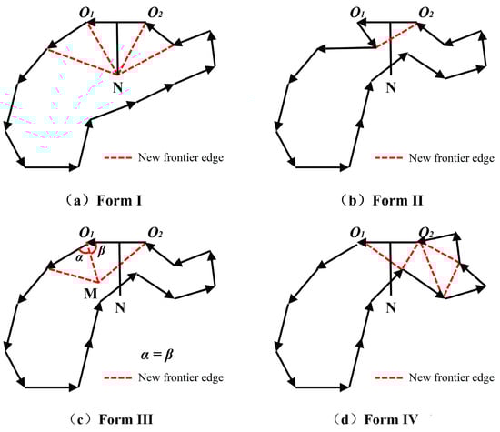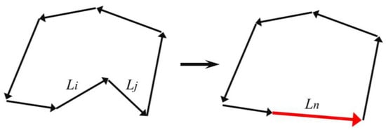 If non-convex, then this neighboring polygon needs to be “convexized” as shown in Figure 5. Screen the first inner angle that exceeds 180°, derive its adjacent front edge segments, and record them as and , respectively. Afterwards, connect the non-common nodes of frontier segments , to generate a new frontier edge . At this time, can be used to replace and , and then the spatial topology of each side of the neighboring polygon can be updated. Afterwards, determine whether the neighboring polygon is convex. If it is convex, then complete the “convexification” [35,36] process; otherwise, continue repeating the above steps until the neighboring polygon becomes convex.