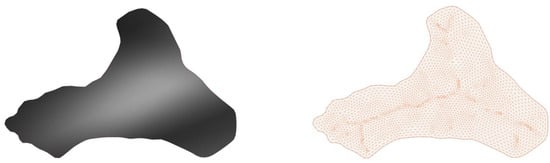 Two examples, a circle and an irregular polygon, were selected to generate the background mesh and adaptive mesh, respectively. As shown in Figure 6 and Figure 7, the size of the adaptive mesh unit was obtained from the background mesh in the left figure. The color shading degree represents the expected size of the mesh unit at this location. A brighter color indicates a smaller expected size, whereas a darker color indicates a larger expected size. The figure on the right presents the adaptive triangle network that is constructed according to the background mesh. The mesh generation results show that the adaptive mesh and background mesh have good fitting ability. The background mesh can be used to flexibly adjust the adaptation of the mesh, and mesh units with a smooth transition and high overall quality can be obtained.