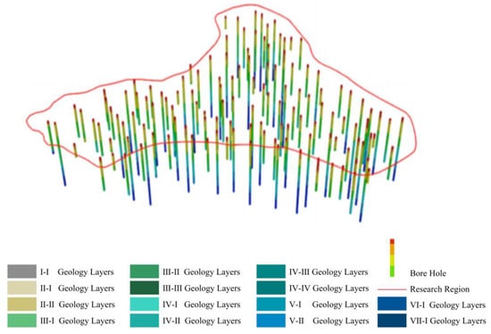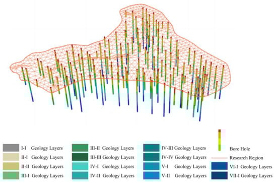 Engineering geological drilling is the main data source for 3D engineering geological modeling, whose 3D drilling model [44,45] is represented by segmented cylinders. Each segment of the cylinder corresponds to different strata. The height of each segment is determined by the thickness of the strata and distinguished by different colors. The visualization results of the engineering geological drilling and the boundary model of the study area are shown in Figure 8. Different geological layers are shaded in different colors. The regional adaptive dynamic TIN model is shown in Figure 9.