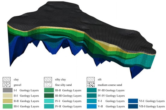 The 3D engineering geological model can visually display the spatial structure and distribution characteristics of geology. Therefore, this model serves as an important auxiliary reference basis for groundwater engineering [1] and the rational development and utilization of urban underground space [2,3]. From the perspective of 3D geometric representation, individual engineering geological objects can be simplified into point, line, surface, and volume objects. Due to the complex distribution and law of underground space, 3D engineering geological modeling usually follows the modeling idea [4,5] from point or line to surface and then from surface to body. With the continuous expansion and deepening of the research and application of 3D modeling technology in geology, a variety of spatial modeling theories have emerged and can be divided into surface models [6,7], solid models [8,9], and hybrid models [10,11], among which surface models mainly describe the objective by simulating the solid surface or interface and then enclosing it into a body approach. The surface model focuses on the surface representation of a 3D spatial entity through which the surface representation forms a 3D body object. Common entities include topographical surfaces, geological surfaces, groundwater surfaces, contours and spatial frames of buildings, and underground projects. Some of the most commonly used surface models include the boundary representation model (B-Rep) [12,13], the wireframe model (Wire Frame) [14,15], and the irregular triangulation network model (TIN) [16,17,18].