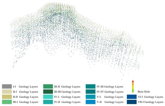 On the basis of the drill hole data retrieved from the study area, the R-TIN-GT hybrid model was used to establish the regional 3D engineering geological model, as shown in Figure 10. The lithology of the strata was then divided into different strata as indicated by different colors and symbols, and the thickness of these layers was determined by the actual thickness of the strata. Figure 11 shows the engineering geological point cloud model, whereas Figure 12 shows the 3D model of engineering geology and the modeling drilling hole fusion model. The spatial distribution characteristics of each engineering geological layer can be viewed by extracting its strata. Figure 13 shows the structural fence of engineering geological layers. After profiling the 3D geological model, a uniform fence surface was established to comprehensively observe the stratigraphic spreading of the entire study area from a spatial scale. Therefore, the fence surface shear model can be used to obtain a 3D perspective profile of the engineering geological model.